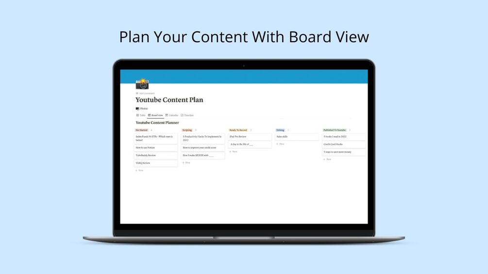 The Content Creator Notion Template has the tools you need to plan your video content, track your performance of your videos on YouTube, organize video tags for video optimization, meet the requirements on the checklist before uploading your video on Youtube and more.